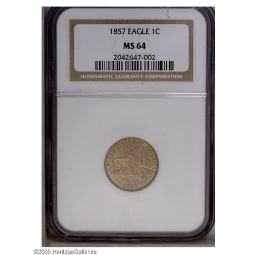 <B>1857<1C> MS64 NGC.</B></I> This satiny apricot and lime-tinged near-Gem has a penetrating strike and clean surfaces. A few interesting mint-made die lines are noted on the eagle's front wing.