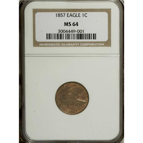 <B>1857 1C MS64 NGC.</B></I> Unusually deep reddish golden-brown color and vibrant luster are attributes of this lovely near-Gem. Fully struck and impressively preserved. A faint die crack connects the eagle's beak to the rim.<BR><BR><b>Shipping:</b> Coins & Currency (<a target="_blank" href="http://www.heritageauctions.com/common/shipping.php">view shipping information</a>)