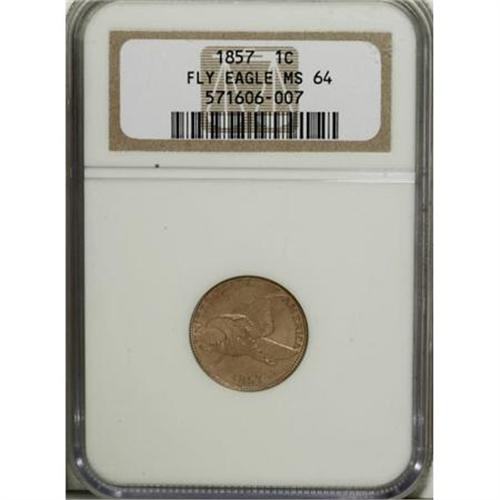 <B>1857 1C MS64 NGC.</B></I> Golden-tan patination covers both sides of this near-Gem Flying Eagle. Some strike softness is noted on the eagle's tail and on the wreath. Close examination reveals no significant marks.<BR><I>From The Madison Collection.</B></I><BR><BR><B>Coin Engraver:</B> James B. Longacre<BR><BR><b>Shipping:</b> Coins & Currency (<a target="_blank" href="http://www.heritageauctions.com/common/shipping.php">view shipping information</a>)