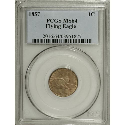 <B>1857 1C MS64 PCGS.</B></I> A decisively struck near-Gem with complete head and tail definition. The cotton leaves are also well detailed. The tan-gold surfaces are satiny and smooth aside from a few minor reverse grazes near 8 o'clock.<BR><I>Ex: Arthur Gordon Gill Estate (Kurt Krueger, 4/87), lot 130.</B></I><BR><BR><b>Shipping:</b> Coins & Currency (<a target="_blank" href="http://www.heritageauctions.com/common/shipping.php">view shipping information</a>)