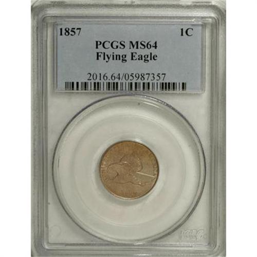 <B>1857 1C MS64 PCGS.</B></I> Boldly struck with just a touch of weakness along the bottoms of ED STAT, and on both of the reverse N's. The obverse is primarily light tan, with amber-orange across much of the reverse. A small spot is observed near the reverse rim at 3 o'clock.<BR><BR><b>Shipping:</b> Coins & Currency (<a target="_blank" href="http://www.heritageauctions.com/common/shipping.php">view shipping information</a>)