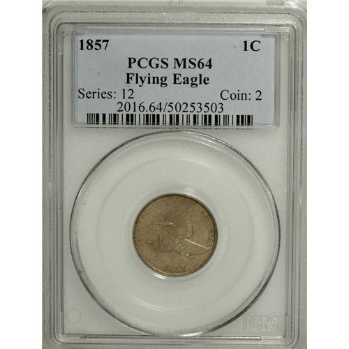 <B>1857 1C MS64 PCGS.</B></I> This satiny, pale tan-brown example is essentially void of marks or carbon, but is limited in grade by soft definition (as made) on the eagle's tail and the wreath highpoints.<BR><BR><b>Shipping:</b> Coins & Currency (<a target="_blank" href="http://www.heritageauctions.com/common/shipping.php">view shipping information</a>)