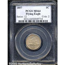 1857 1C MS64 PCGS. The strike is particularly sharp on the obverse and light golden-tan surfaces have a few flickers of carbon here and there, the most obvious seen in front of the eagle's beak. Important notice: Heritage usually auctions material at the rate of 200-250 lots per hour. On some occasions eBay Live bid software or the Internet may not be able to keep up with the pace of the auction. We recommend placing a realistic absentee bid now as insurance to avoid disappointment. Occasionally the auctioneer may eliminate or reject an eBay Live bid, and the auctioneer may also reopen a lot after the close of the eBay live bidding (usually because we missed an audience bid), and may reject your bid even if it shows you as the winning bidder. By bidding via eBay Live, you agree that Heritage may award the lot to another bidder at its sole discretion under the circumstances described above or any other reasonable circumstances. Also please note that all Heritage lots purchased through eBay Live carry a 20% Buyer's Premium. Please make sure you read the Terms and Conditions before you bid.