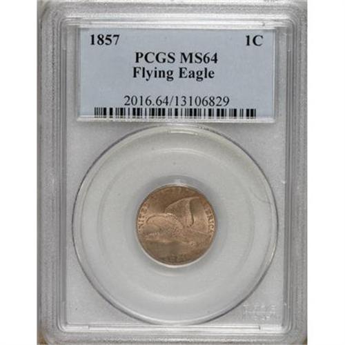 <B>1857 1C MS64 PCGS.</B></I> Beige and violet-tinged tan are the predominant colors on this lovely Choice example. Solidly defined and immensely appealing with a single carbon fleck on the eagle's left wing.<BR><BR><b>Shipping:</b> Coins & Currency (<a target="_blank" href="http://www.heritageauctions.com/common/shipping.php">view shipping information</a>)