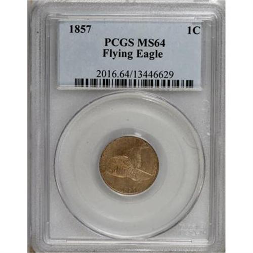 <B>1857 1C MS64 PCGS.</B></I> Luminous salmon and orange surfaces with few marks are the primary attraction for this pleasing near-Gem. While the eagle has strong detail overall, the tailfeathers are a touch soft, and weakness is noted at parts of the wreath. A lovely example of the first circulation-strike small cent issue.<BR><BR><B>Coin Engraver:</B> James B. Longacre<BR><BR><b>Shipping:</b> Coins & Currency (<a target="_blank" href="http://www.heritageauctions.com/common/shipping.php">view shipping information</a>)