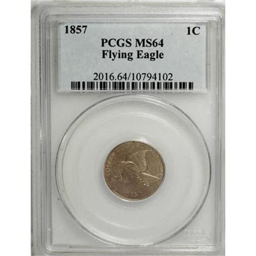 <B>1857 1C MS64 PCGS.</B></I> Choice and boldly struck with very few marks overall. The color is predominantly salmon-orange on the obverse and the reverse has more tan color. A few minor carbon spots are seen on the obverse.<BR><BR><B>Coin Engraver:</B> James B. Longacre<BR><BR><b>Shipping:</b> Coins & Currency (<a target="_blank" href="http://www.heritageauctions.com/common/shipping.php">view shipping information</a>)