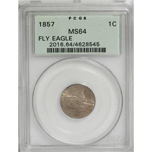 <B>1857 1C MS64 PCGS.</B></I> Snow-4, Die State B. FS-002. The tan toning is beautiful and consistent throughout. Lustrous and well preserved with minor weakness on the cotton leaves and eagle's extremities. In a green label holder.<BR><I>From The Madison Collection.</B></I><BR><BR><B>Coin Engraver:</B> James B. Longacre<BR><BR><b>Shipping:</b> Coins & Currency (<a target="_blank" href="http://www.heritageauctions.com/common/shipping.php">view shipping information</a>)
