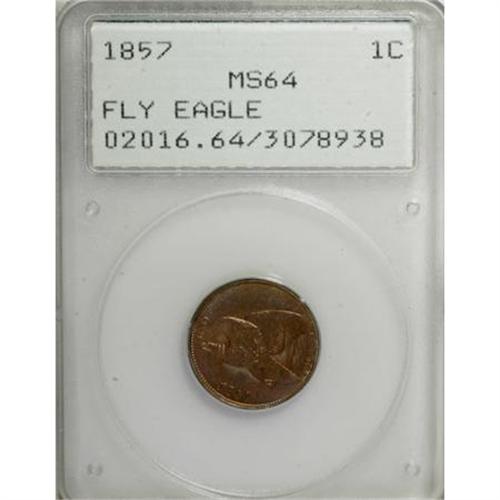 <B>1857 1C MS64 PCGS.</B></I> Fantastic orange-gold luster displays splashes of green-gray, and an attentive strike results in relatively sharp definition on the design features. A handful of minute contact marks on the obverse defines the grade. Housed in a first generation holder.<BR><BR><B>Coin Engraver:</B> James B. Longacre<BR><BR><b>Shipping:</b> Coins & Currency (<a target="_blank" href="http://www.heritageauctions.com/common/shipping.php">view shipping information</a>)