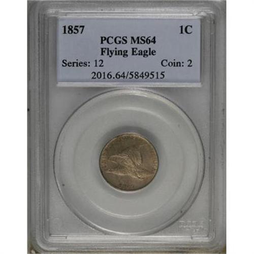 <B>1857 1C MS64 PCGS.</B></I> An outstanding representative of this briefly produced type. The gold-tan surfaces display even, satiny luster. A series of shallow, parallel marks in the upper right obverse field appear mechanically produced, perhaps by a counting device. The reverse is abrasion-free. <BR><BR><B>Coin Engraver:</B> James B. Longacre<BR><BR><b>Shipping:</b> Coins & Currency (<a target="_blank" href="http://www.heritageauctions.com/common/shipping.php">view shipping information</a>)