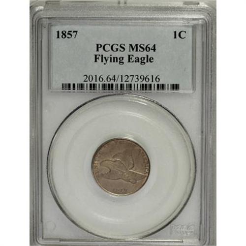 <B>1857 1C MS64 PCGS.</B></I> Delicate salmon, peach, and orange shadings grace each side of this captivating near-Gem. A well-defined piece that shows only a few tiny abrasions in the fields.<BR><BR><B>Coin Engraver:</B> James B. Longacre<BR><BR><b>Shipping:</b> Coins & Currency (<a target="_blank" href="http://www.heritageauctions.com/common/shipping.php">view shipping information</a>)