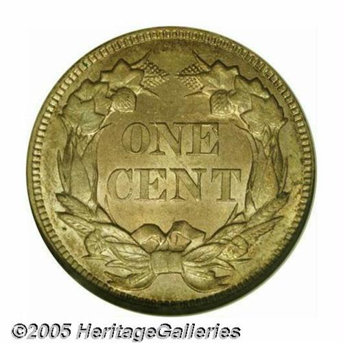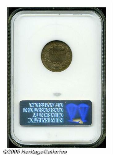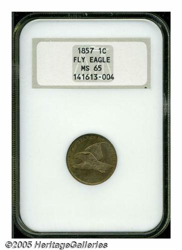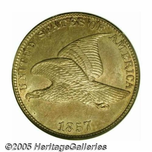 <B>1857<1C> MS65 NGC.</B></I> An uncommonly bold striking for this ever-popular type, being satiny and richly toned in autumn-gold and steel-blue shades. Several tiny specks of carbon on the left side of the obverse, one immediately below the eagle's beak, provide ready attribution.