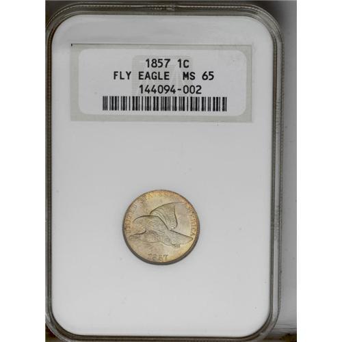 <B>1857<1C> MS65 NGC.</B></I> Beautiful lime-green, peach, and golden toning ensures the eye appeal of this vibrantly lustrous Gem. Well struck and nicely preserved, with a superficial abrasion below S O on the upper obverse as the only minor detraction. Flying Eagle cents are a perennial favorite with collectors, combining both beauty of design with the desirability of a short-lived type.