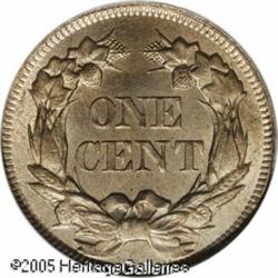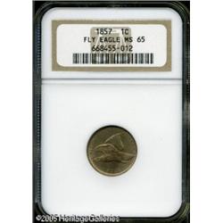 <B>1857 1C MS65 NGC.</B></I> Consistently well defined with a splash of pale orange and lilac patina on the obverse. Gem examples of this short-lived type coin always seem to be in short supply. Lot:5178
