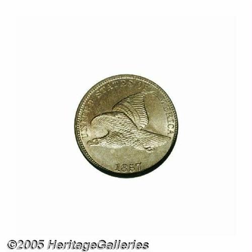<B>1857<1C> MS65 NGC.</B></I> Light golden-brown in color, this magnificent Gem possesses potent cartwheel shimmer. The strike on Flying Eagle Cents is often soft on the eagle's head and tail and on the edges of the wreath. However, the strike is bold on all these areas on the present piece. The eye appeal is further ensured by the undisturbed appearance of the fields and devices.