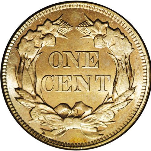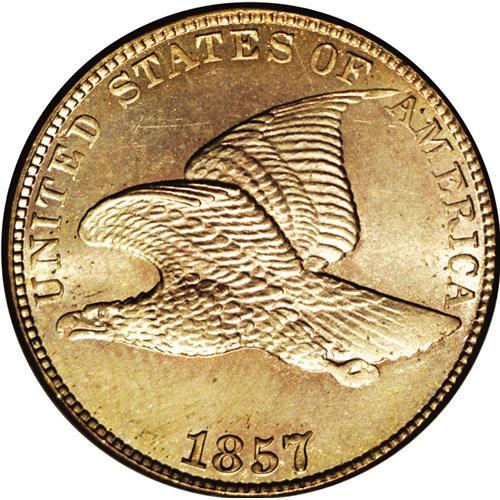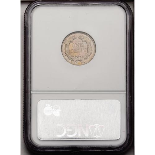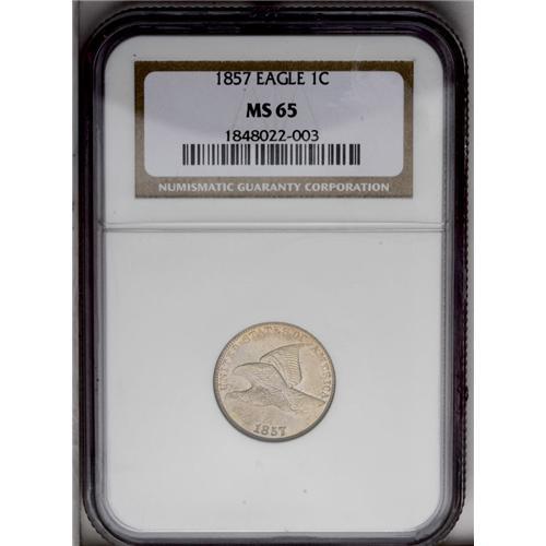 <B>1857<1C> MS65 NGC.</B></I> The 1857 Flying Eagle cent was popular with the general public and saved in large quantities. This lovely Gem has softly frosted mint luster and the surfaces display pinkish-tan and golden iridescence. A bit softly struck, as often seen on this date.<BR><I>From The Lewis (Tahoe) Collection.</B></I>
