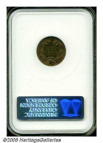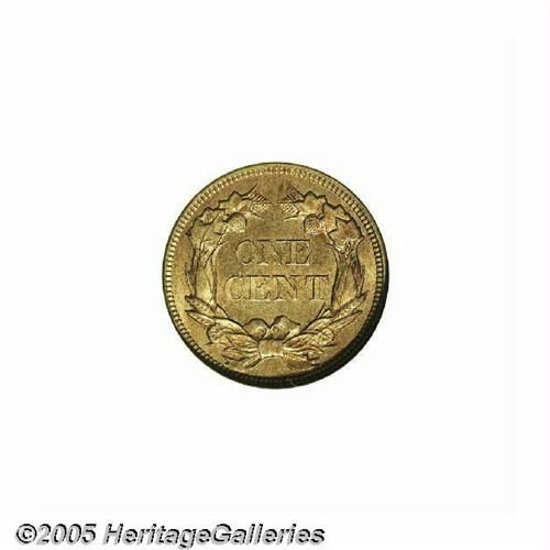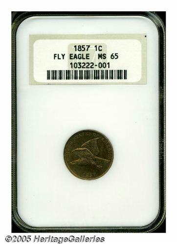<B>1857<1C> MS65 NGC.</B></I> The design elements are surprisingly sharp on this solid Gem Flying Eagle Cent, which is often found weakly defined. The surfaces display uniform golden-red and autumn-leaves coloration with a partial reflective appearance in the fields. The only mentionable defects are a couple of tiny carbon spots and a small planchet flake under the AM of AMERICA.