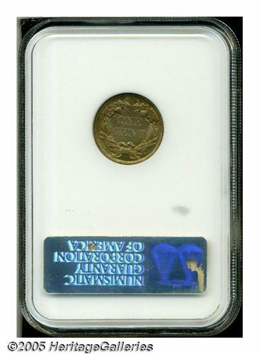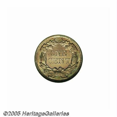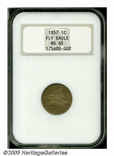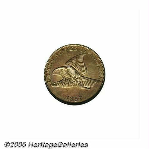 <B>1857<1C> MS65 NGC.</B></I> Well struck with noteworthy semi-prooflikeness in the fields, which is quite unusual for the type, rich golden-tan and reddish-tan color over each side of the coin, and lovely rainbow toning near the obverse and reverse peripheries. The carefully preserved surfaces are blemish-free on the obverse, and only show two or three tiny nicks near the center of the reverse. A faint toning streak, on the lower obverse, connects the top of "7" to the eagle's belly. An impressive Gem Flying Eagle Cent.