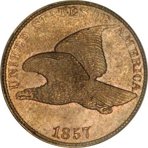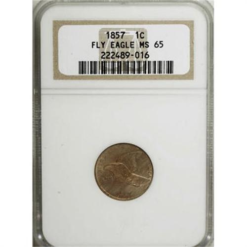 <B>1857 1C MS65 NGC.</B></I> A smooth and satiny Gem with impressive sharpness on the flying eagle. Occasional portions of the legends and wreaths are incompletely brought up. The medium tan and olive toning is original, and carbon is absent throughout the obverse. An infrequent pinpoint fleck visits the reverse periphery.<BR><BR><B>Coin Engraver:</B> James B. Longacre<BR><BR><b>Shipping:</b> Coins & Currency (<a target="_blank" href="http://www.heritageauctions.com/common/shipping.php">view shipping information</a>)