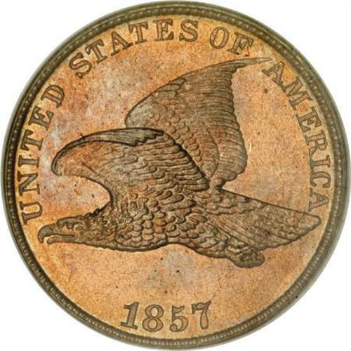 <B>1857 1C MS65 NGC.</B></I> Considerable eye appeal is the hallmark of this sharp Gem coin, with mostly red surfaces on each side. A couple of infrequent flecks of carbon fail to detract from the appeal, and the strike is boldly executed. A wispy die crack joins the eagle's head with the rim at about 9 o'clock.<BR><BR><B>Coin Engraver:</B> James B. Longacre<BR><BR><b>Shipping:</b> Coins & Currency (<a target="_blank" href="http://www.heritageauctions.com/common/shipping.php">view shipping information</a>)
