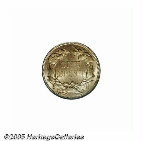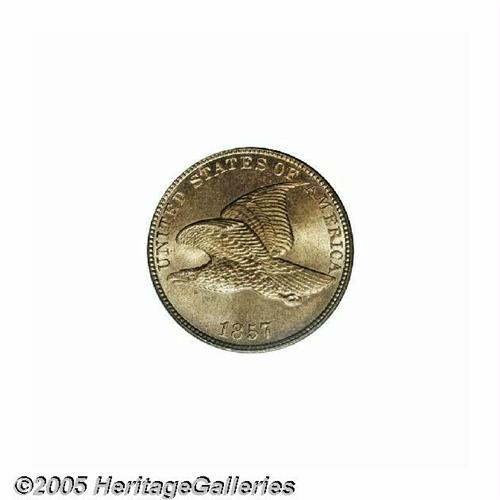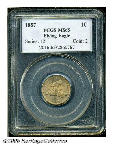 <B>1857<1C> MS65 PCGS.</B></I> Far better struck than the typically offered survivor of this popular Small Cent issue, there are no areas of incomplete definition on the obverse, some of the highest points on the wreath are slightly soft. The color is a rich, original, honey-gold shade, and the luster is richly frosted in texture. Tiny mottled areas of russet-brown color lend eye appeal and full originality. An ideal type coin.