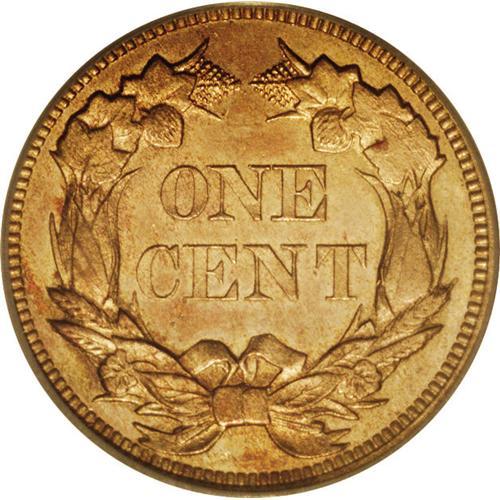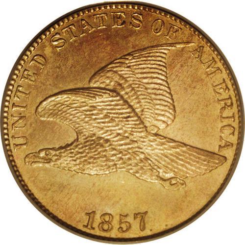 <B>1857<1C> MS65 PCGS.</B></I> Sharper struck than many 1857 Flying Eagle cents, the surfaces show deep golden-honey color with subtle shades of red and blue intermixed. The only noticeable flaw is a horizontal abrasion in the field above the date. This short-lived type coin is always of interest to collectors.
