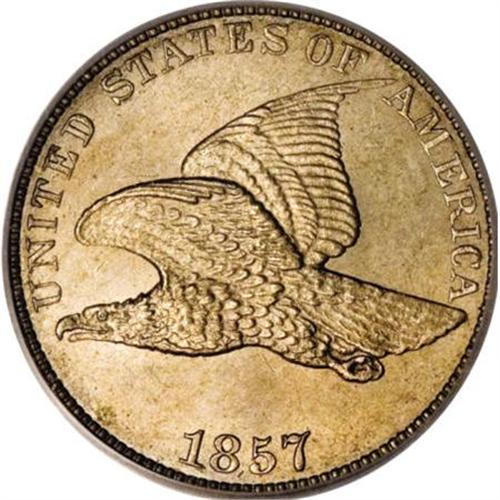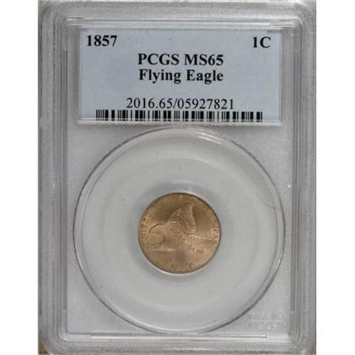 <B>1857 1C MS65 PCGS.</B></I> This popular issue was initially heavily saved because of its novelty. The Gem presented in this sale is exceptionally well struck for the type. The eagle's plumage is crisp, save for minor softness on the end of the tail feathers. The entire reverse wreath is also sharp. Lustrous surfaces exhibit pretty golden-tan color, and are free of mentionable marks. A wonderful type coin!<BR><BR><b>Shipping:</b> Coins & Currency (<a target="_blank" href="http://www.heritageauctions.com/common/shipping.php">view shipping information</a>)