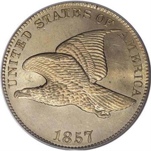 <B>1857 1C MS66 PCGS.</B></I> Obverse Style of 1856. Snow-1. A noteworthy variety that can be recognized in several ways. The A and M are slightly separated even though this is a Large Letters variety. The interior of the O in OF has a rectangular appearance. The Es and F are closed at the top and the 7 in the date is centered between two denticles. On the reverse, this is a High Leaves variety but the right leaf is lower than usual. This shimmering honey-tan representative is very well struck and only the most insignificant luster grazes affect silky-smooth surfaces. Population: 15 in 66, 0 finer (7/07).<I><BR>From The Santa Fe Collection.</B></I><BR><BR><B>Coin Engraver:</B> James B. Longacre<BR><BR><b>Shipping:</b> Coins & Currency (<a target="_blank" href="http://www.heritageauctions.com/common/shipping.php">view shipping information</a>\)