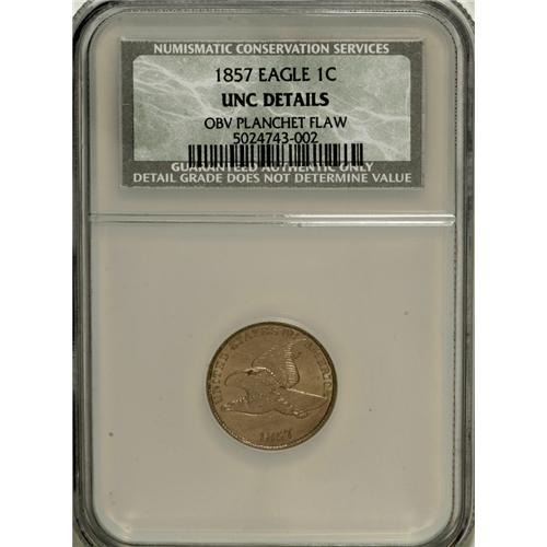 <B>1857 1C --Obverse Planchet Flaw--NCS. Unc Details.</B></I> NGC Census: (18/3498). PCGS Population (38/2011). Mintage: 17,450,000. Numismedia Wsl. Price for NGC/PCGS coin in MS60: $280. (#2016)<BR><BR><b>Shipping:</b> Coins & Currency (<a target="_blank" href="http://www.heritageauctions.com/common/shipping.php">view shipping information</a>)