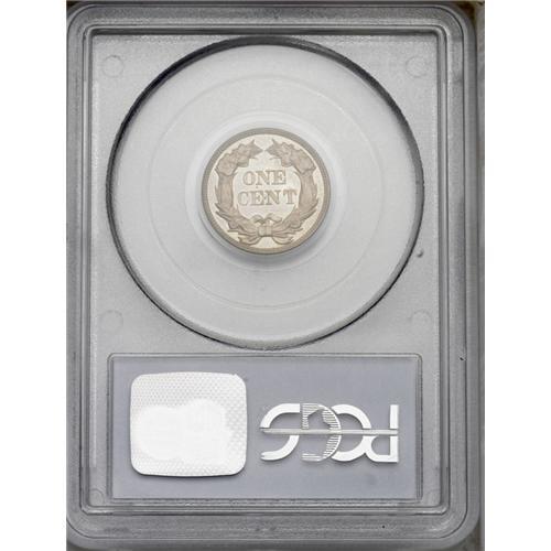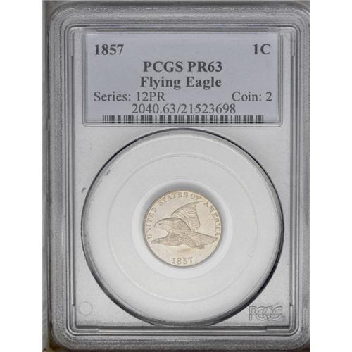 <B>1857<1C> PR63 PCGS.</B></I> Snow-PR3. DDO 4-O-I. Bright and reflective with a short streak of toning above the date. Examination with a magnifier will find a small planchet flake near the forward peak of the left wing of the eagle, with a complex lint mark above. Boldly struck throughout and an attractive coin for the grade. Curiously, on the reverse the engraver used the closed E for the ONE and the open E letter punch for CENT. It would appear that a few hundred of these were struck in Proof, and the present coin would be a good representative for a type or date collector. <BR><BR><B>Important notice:</B> Heritage usually auctions material at the rate of 200-250 lots per hour. On some occasions eBay Live bid software or the Internet may not be able to keep up with the pace of the auction. We recommend placing a realistic absentee bid now as insurance to avoid disappointment. Occasionally the auctioneer may eliminate or reject an eBay Live bid, and the auctioneer may also reopen a lot after the close of the eBay live bidding (usually because we missed an audience bid), and may reject your bid even if it shows you as the winning bidder. By bidding via eBay Live, you agree that Heritage may award the lot to another bidder at its sole discretion under the circumstances described above or any other reasonable circumstances. Since eBay bids are not shown to us until we open the lot on the floor, we treat those bids just like floor bids. In most cases the floor responds before the eBay bid is presented to us, due to Internet lag time, so for consistency we have made it a policy that floor bids are always considered first over tie eBay live bids. Also please note that all Heritage lots purchased through eBay Live carry a 20% Buyer's Premium. Please make sure you read the Terms and Conditions before you bid. This lot is being auctioned in conjunction with a live floor auction by Heritage Galleries & Auctioneers. All final auction and invoice information will be supplied by Heritage Galleries & Auctioneers, and all other information should be considered preliminary. Lot:363 <BR><BR><B>Winning Notification and Billing:</B> After the FINAL session in this auction is complete, Heritage will send e-mail and snail mail invoices. This process normally takes several days. All final auction and invoice information will be supplied by Heritage Galleries & Auctioneers, and all other information should be considered preliminary. <BR><BR>This auction will be conducted on a live auction floor and over the Internet through eBay Live. If you choose to place an absentee bid, please take a moment to <font color='#0000ff'><u><a href='http://pages.ebay.com/liveauctions/help/before/laabsentee.html'>learn how eBay Live absentee bidding works</a></u></font><font color='#000000'>
