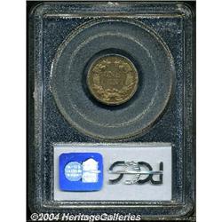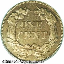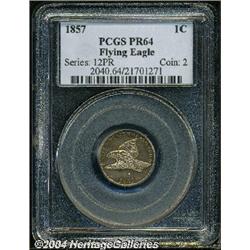 <B>1857<1C> PR64 PCGS.</B></I> The success of the new Flying Eagle design is most easily seen by a short quote from Rick Snow's book on the series, "In three short years the Mint had produced more nickel cents than in the prior sixty four years of producing the old large cents!" And while more than 17 million cents were struck this year as business strikes, only 50 proofs are believed to have been minted, making this a major proof rarity from the 19th century. This is a deeply reflective example that shows pinpoint striking definition in all areas. The surfaces are bright with pale tan color overall and a few dabs of deeper golden scattered about. A lovely coin overall. Population: 19 in 64, 11 finer (9/04). <BR><BR><B>Important notice:</B> Heritage usually auctions material at the rate of 200-250 lots per hour. On some occasions eBay Live bid software or the Internet may not be able to keep up with the pace of the auction. We recommend placing a realistic absentee bid now as insurance to avoid disappointment. Occasionally the auctioneer may eliminate or reject an eBay Live bid, and the auctioneer may also reopen a lot after the close of the eBay live bidding (usually because we missed an audience bid), and may reject your bid even if it shows you as the winning bidder. By bidding via eBay Live, you agree that Heritage may award the lot to another bidder at its sole discretion under the circumstances described above or any other reasonable circumstances. Since eBay bids are not shown to us until we open the lot on the floor, we treat those bids just like floor bids. In most cases the floor responds before the eBay bid is presented to us, due to Internet lag time, so for consistency we have made it a policy that floor bids are always considered first over tie eBay live bids. Also please note that all Heritage lots purchased through eBay Live carry a 20% Buyer's Premium. Please make sure you read the Terms and Conditions before you bid.