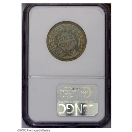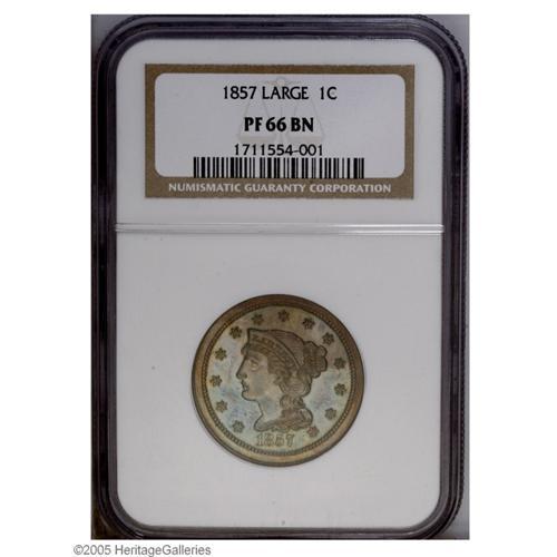 <B>1857<1C> PR66 Brown NGC.</B></I> N-3, Low R.5. A bold die line on Liberty's bust truncation confirms this rare proof-only variety. The denticles and stars are each needle-sharp, and LIBERTY appears to be fully struck. The lovely chocolate-brown surfaces are accented with turquoise-blue in the recesses, beautifully preserved, and seemingly free from even the faintest contact. Only 10 pieces have been certified Proof 66 Brown by both services, none are finer (10/05).