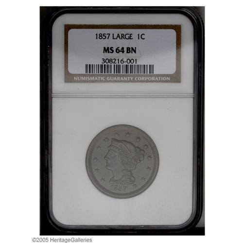 1857 1C Small Date MS64 Brown NGC. N-2, High R.1. Trac 1857[1C] Small Date MS64 Brown NGC.