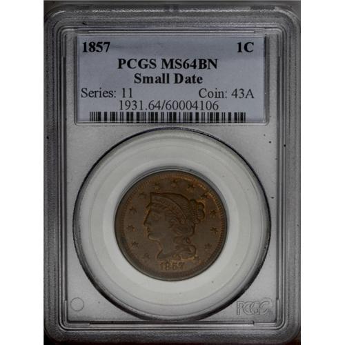 <B>1857<1C> Small Date MS64 Brown PCGS.</B></I> N-4, R.1. Die State c. A splendid example of the final large cent date. This cent has light brown surfaces intermingled with splashes of orange mint luster. EAC 60+.<BR><I>From The Craig A. Stevens Registry Collection of Large Cents.</B></I> <BR><BR><B>Important notice:</B> Heritage usually auctions material at the rate of 200-250 lots per hour. On some occasions eBay Live bid software or the Internet may not be able to keep up with the pace of the auction. We recommend placing a realistic absentee bid now as insurance to avoid disappointment. Occasionally the auctioneer may eliminate or reject an eBay Live bid, and the auctioneer may also reopen a lot after the close of the eBay live bidding (usually because we missed an audience bid), and may reject your bid even if it shows you as the winning bidder. By bidding via eBay Live, you agree that Heritage may award the lot to another bidder at its sole discretion under the circumstances described above or any other reasonable circumstances. Since eBay bids are not shown to us until we open the lot on the floor, we treat those bids just like floor bids. In most cases the floor responds before the eBay bid is presented to us, due to Internet lag time, so for consistency we have made it a policy that floor bids are always considered first over tie eBay live bids. Also please note that all Heritage lots purchased through eBay Live carry a 20% Buyer's Premium. Please make sure you read the Terms and Conditions before you bid. This lot is being auctioned in conjunction with a live floor auction by Heritage Galleries & Auctioneers. All final auction and invoice information will be supplied by Heritage Galleries & Auctioneers, and all other information should be considered preliminary. Lot:348 <BR><BR><B>Winning Notification and Billing:</B> After the FINAL session in this auction is complete, Heritage will send e-mail and snail mail invoices. This process normally takes several days. All final auction and invoice information will be supplied by Heritage Galleries & Auctioneers, and all other information should be considered preliminary. <BR><BR>This auction will be conducted on a live auction floor and over the Internet through eBay Live. If you choose to place an absentee bid, please take a moment to <font color='#0000ff'><u><a href='http://pages.ebay.com/liveauctions/help/before/laabsentee.html'>learn how eBay Live absentee bidding works</a></u></font><font color='#000000'>