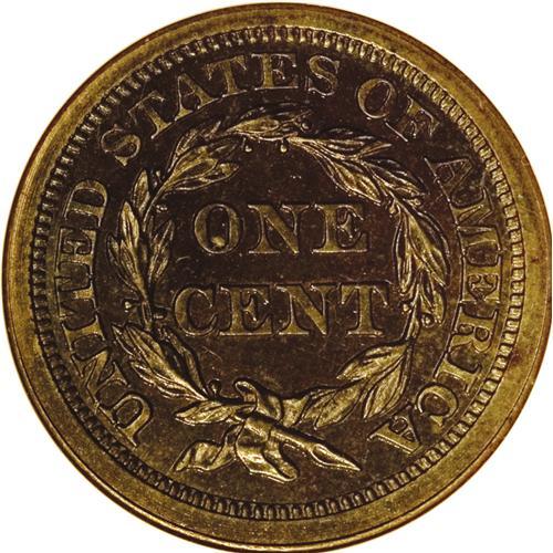 <B>1857<1C> Small Date PR65 Brown NGC.</B></I> N-5, High R.5. Deep mahogany-brown with glass-smooth fields and the razor-sharp strike that betrays the coin's status as a proof. A trace of mint red is visible to the left of Liberty's nose and mouth. N-5 is the scarcer of the two proof-only varieties in this final year of large cent production, and can be attributed by a small die lump at the base of the T in the denomination, and by a small raised line to the right of Liberty's nose (as struck). A small nick to the left of star 1 can serve as a pedigree identifier. EAC PR60.