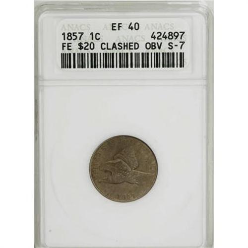 <B>1857 1C --$20 Clashed Obverse--XF40 ANACS.</B></I> Snow-7. FS-004. The obverse die clashed with a double eagle obverse die. In his flying eagle attribution guide from 2001, specialist Rick Snow wrote "this exciting variety has proven to be very rare in all grades and as of this writing, no examples are known in MS condition." A medium brown example with light wear on the breast and softness of strike on the tail.<BR><I>From The Madison Collection.</B></I><BR><BR><B>Coin Engraver:</B> James B. Longacre<BR><BR><b>Shipping:</b> Coins & Currency (<a target="_blank" href="http://www.heritageauctions.com/common/shipping.php">view shipping information</a>)
