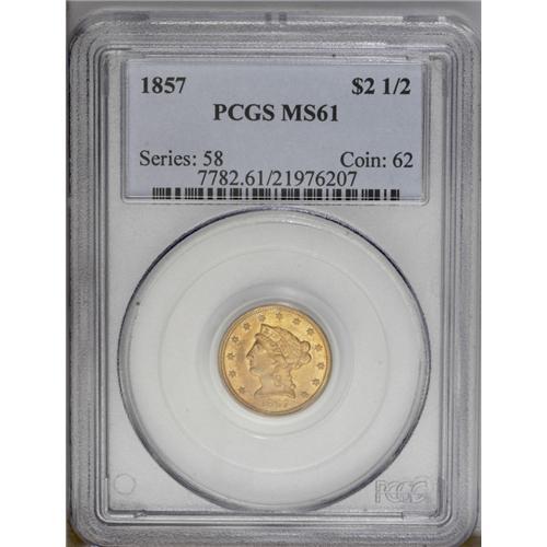 1857 $2 1/2 MS61 PCGS. The design elements are sharply 1857[$2 1/2] MS61 PCGS.