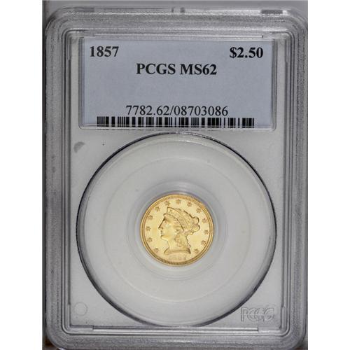 <B>1857<$2 1/2> MS62 PCGS.</B></I> An attractive, lustrous example of this seldom-seen date. This is a wonderful high grade specimen of this scarce issue. Population: 32 in 62, 29 finer (8/06).<BR><I>From The Della Collection.</B></I>