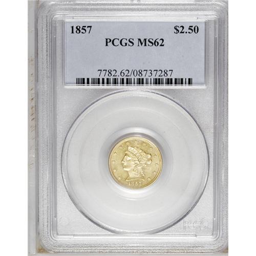 <B>1857<$2 1/2> MS62 PCGS.</B></I> Exhibiting some faint die striations, this coin is well struck, lustrous, and quite eye-appealing.