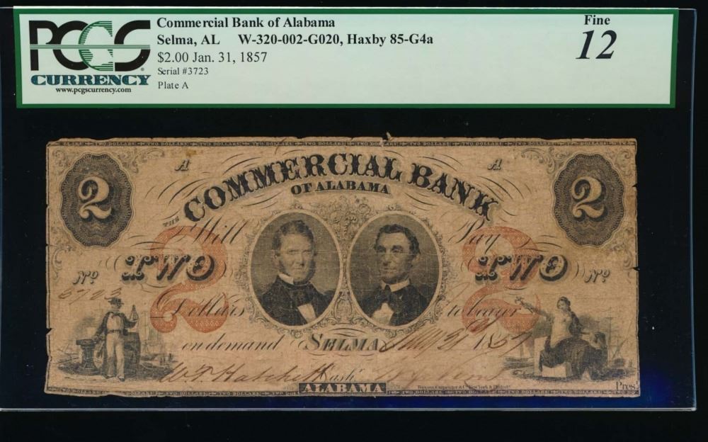 One 1857 $2 Commercial Bank of Alabama Obsolete Note PCGS 12.