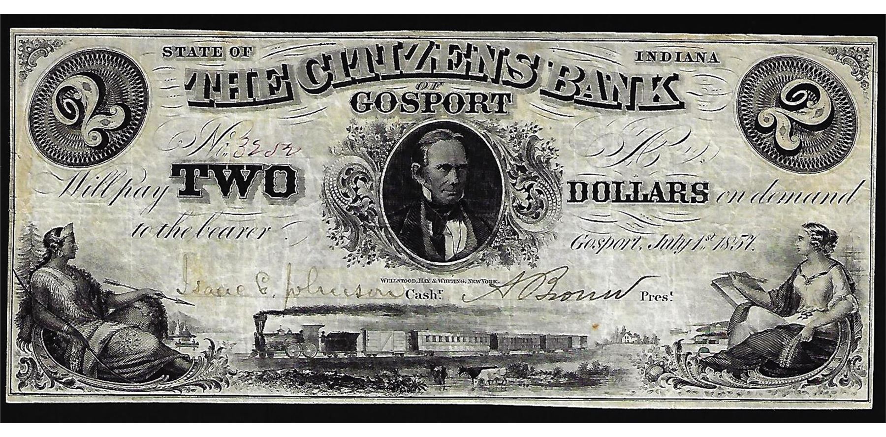 One 1857 $2 The Citizens Bank of Gosport Obsolete Note.