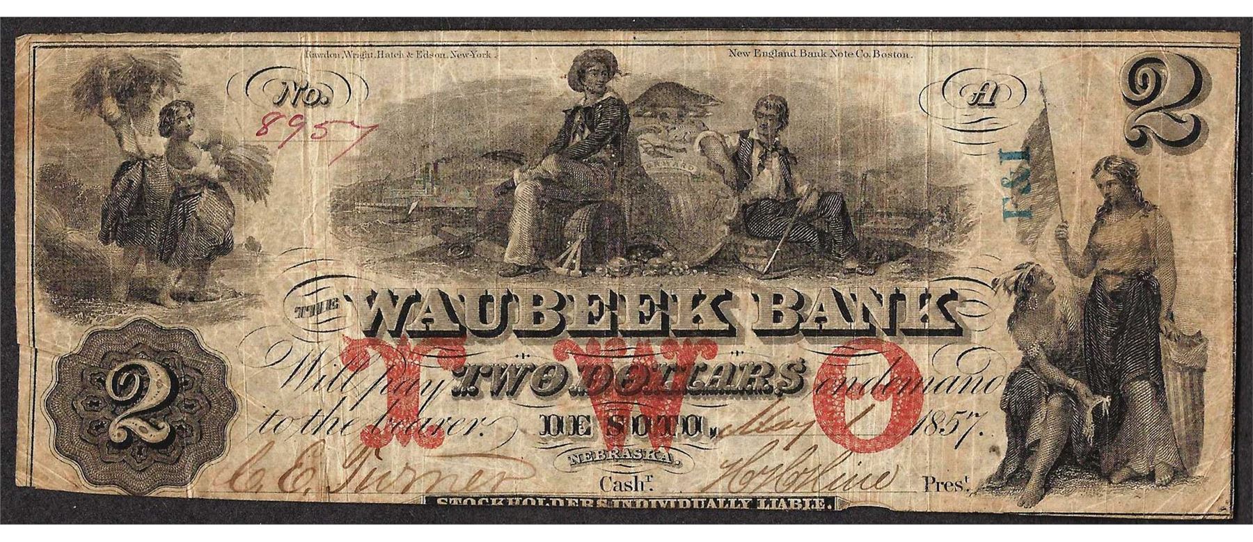 One 1857 $2 The Waubeek Bank Obsolete Note.