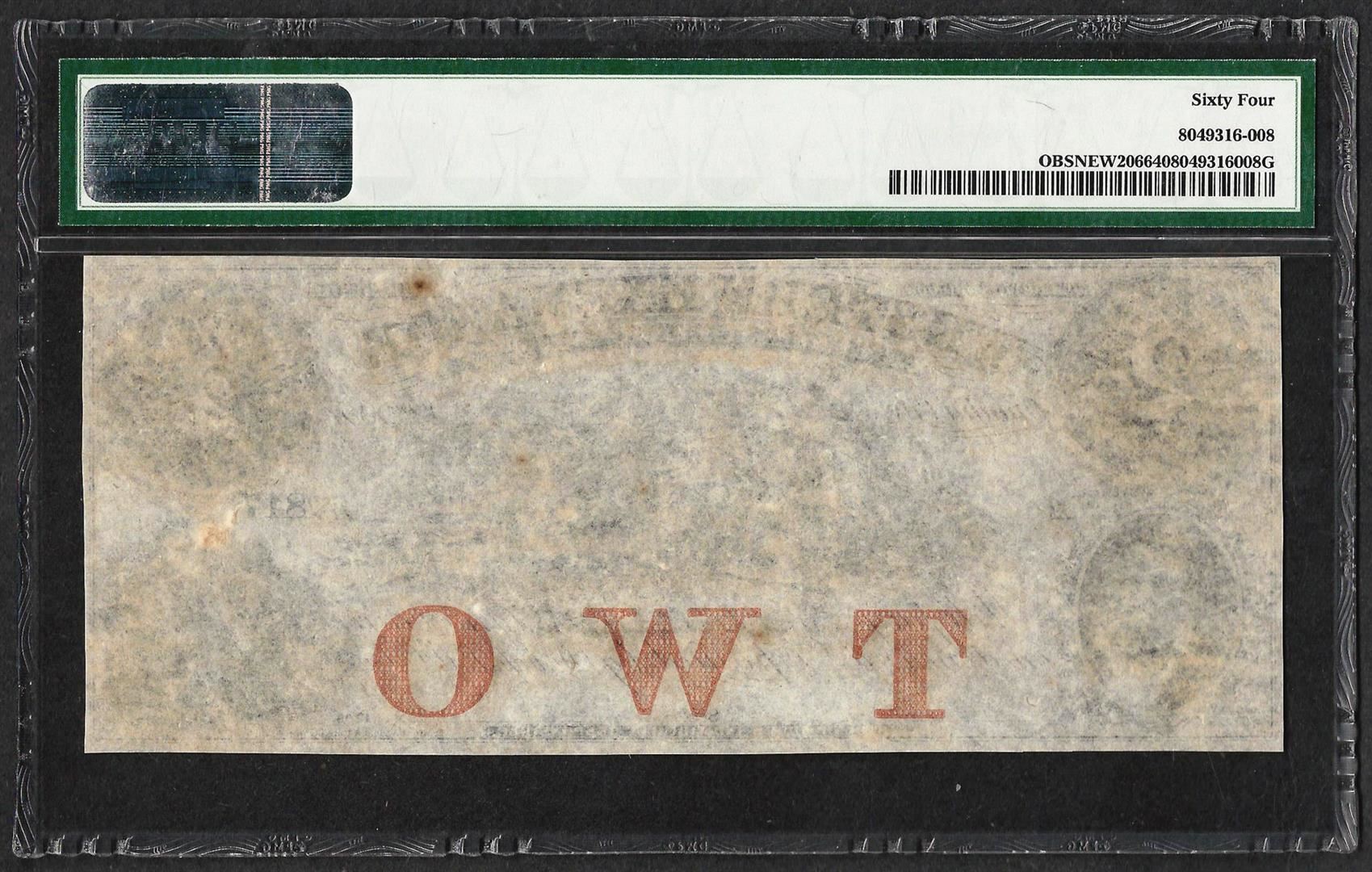 One 1857 $2 Western Exchange Fire & Marine Insurance Co. Note PMG Choice Uncirculated 64. PMG Certified.