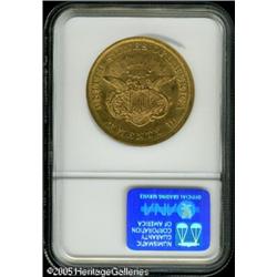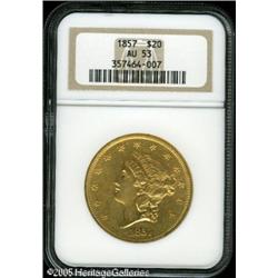 <B>1857 $20 AU53 NGC.</B></I> Well struck with an attractive appearance and partial remaining luster. Here is another moderately rare issue from the mother mint in Philadelphia, of which Akers noted: "Most available specimens grade VF or EF, although AUs and an occasional Unc are also seen from time to time." Lot:8959