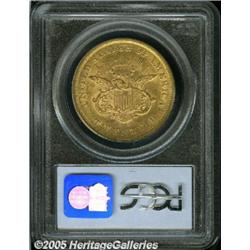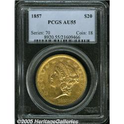 <B>1857 $20 AU55 PCGS.</B></I> Softly struck with considerable luster, for an AU coin, with pleasing green-gold coloration, and extensively abraded on both sides. A moderately scarce Philadelphia issue. Population: 23 in 55, 55 finer (2/05).