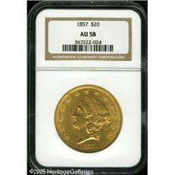 <B>1857 $20 AU58 NGC.</B></I> Sharp throughout with an attractive orange-gold appearance and significant amounts of luster remaining over the surfaces. A tough coin to locate in Mint State.<BR><I>From The Richard J. Chouinard Collection of United States Coins, Part Two.</B></I> Lot:8961