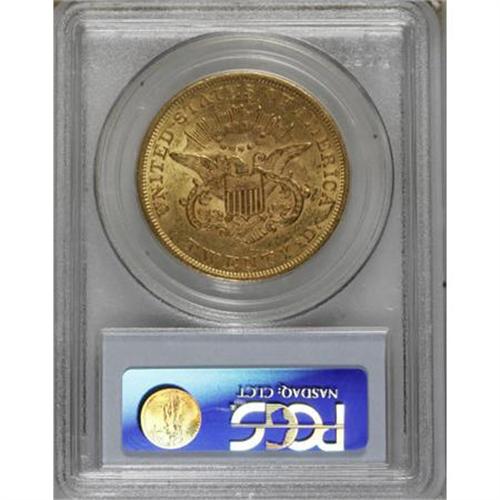<B>1857 $20 AU58 PCGS.</B></I> Boldly impressed for the issue with largely intact luster in the gold-orange fields. Wispy abrasions populate the fields, while the devices show a touch of friction on the high points. Population: 32 in 58, 45 finer (2/08).<BR><BR><B>Coin Engraver:</B> James B. Longacre<BR><BR><b>Shipping:</b> Coins & Currency (<a target="_blank" href="http://www.heritageauctions.com/common/shipping.php">view shipping information</a>)