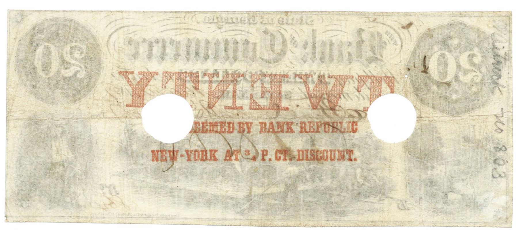 One 1857 $20 Bank of Commerce, Savannah, GA Bank Note - Hole Puched