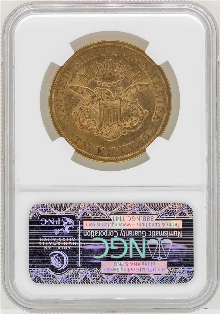 One 1857 $20 Liberty Head Double Eagle Gold Coin NGC AU Details. NGC Certified.