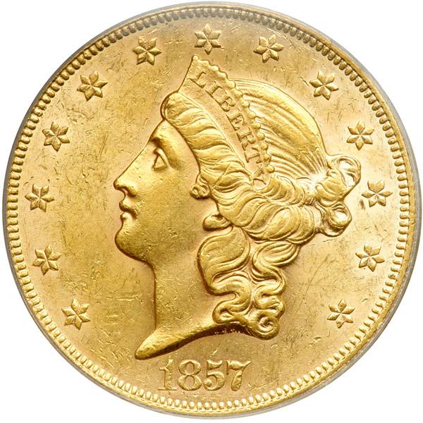 1857. PCGS graded AU-58 CAC Approved. This coin should grade full Mint State, the fields being decidedly frosted. Pop 35; 56 finer (PCGS # 8920) .