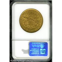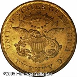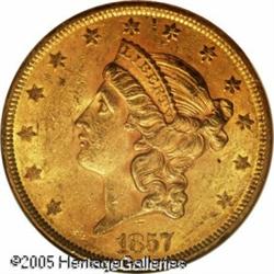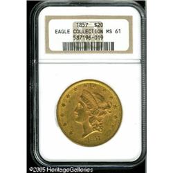 <B>1857 $20 MS61 NGC.</B></I> Ex: Eagle Collection. The 1857 is not as scarce and underrated in high grades as the 1856, but is another Philadelphia issue that still has not received its due in higher grade. An estimated 20-30 pieces are known in Uncirculated with most in the MS60-61 grade range. For some reason, many of the Uncirculated 1857 Double Eagles offered in recent years show minor planchet problems. The Dallas Bank Collection coin had a long, thin planchet streak on the obverse and we have seen at least one or two others with Mint-made roughness in the fields. This NGC MS61 example is not quite in the Condition Census, but neither is it far from it. The only mint-made planchet defect we see on this piece is a tiny planchet void out of the right obverse field. The surfaces have rich reddish-golden coloration and are fully lustrous. However, as one might expect from the grade, numerous small abrasions are scattered over each side. The central details are sharply defined but there is noticeable softness on several of the peripheral stars. Population: 12 in 61, 7 finer (1/05). Lot:8967